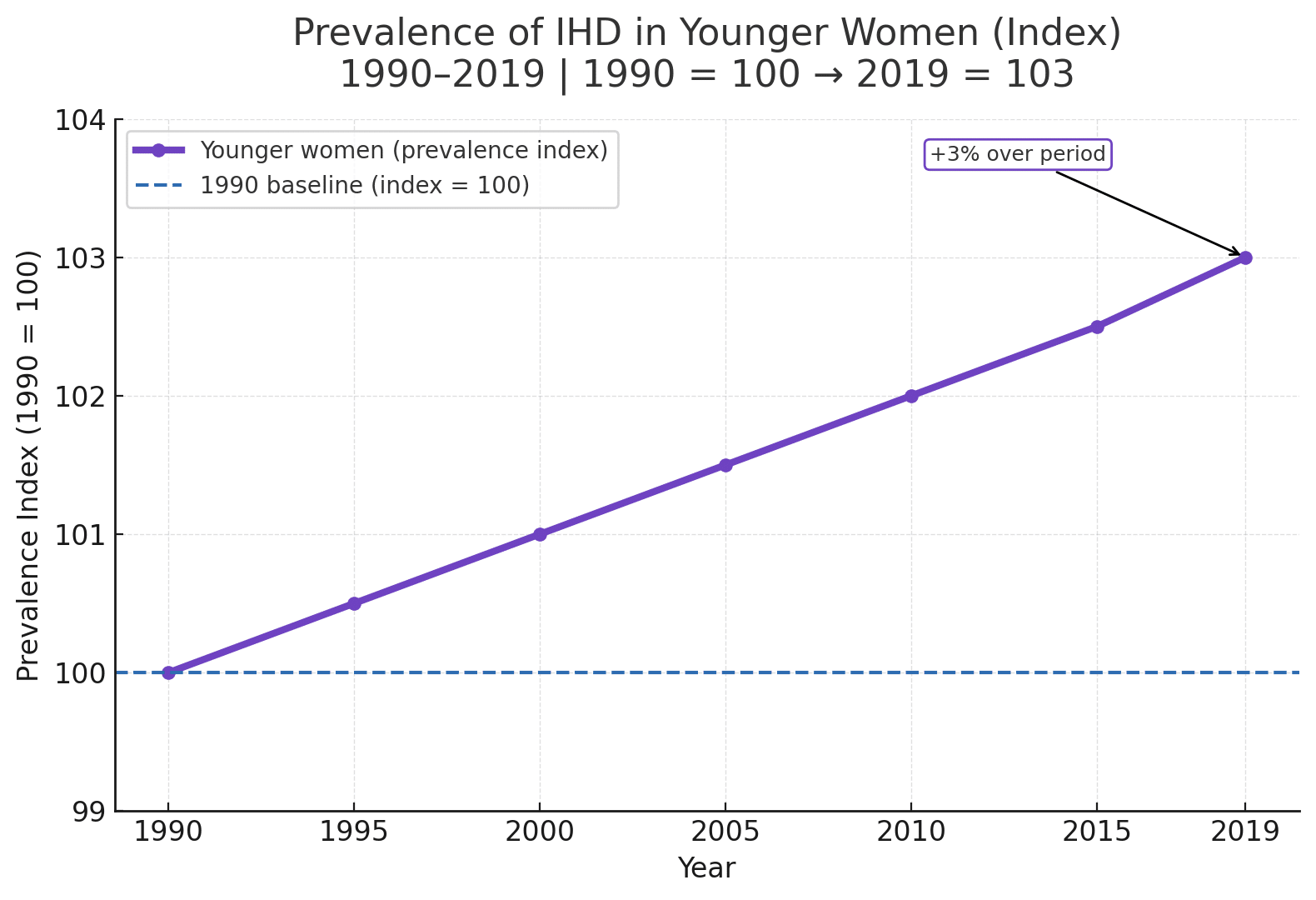 Between 1990 and 2019, the prevalence of IHD increased by approximately 3% in younger women, despite overall declines in global IHD mortality. Alarmingly, in some high-income countries, mortality from IHD in younger women is increasing, a trend not seen in their male counterparts¹³.